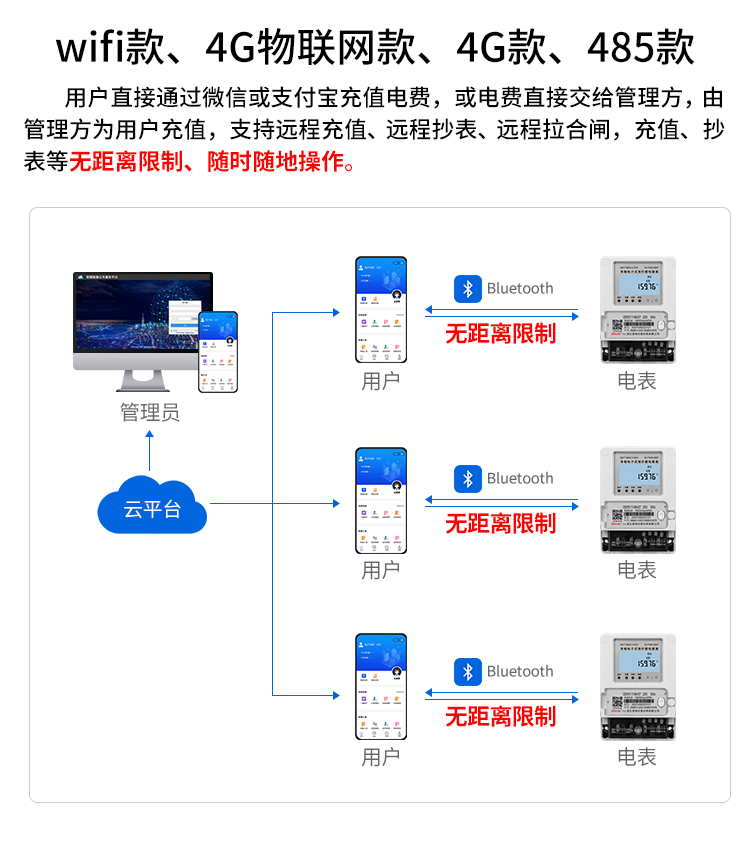 支持對(duì)已開(kāi)戶電表進(jìn)行遠(yuǎn)程售電或退電,并且支持儀表計(jì)費(fèi)和平臺(tái)計(jì)費(fèi)兩種模式。儀表計(jì)費(fèi)金額直接下發(fā)給電表,儀表自動(dòng)計(jì)算電費(fèi),平臺(tái)計(jì)費(fèi)金額充入平臺(tái)賬戶,每次抄表進(jìn)行結(jié)算,計(jì)費(fèi)方式更加豐富。
