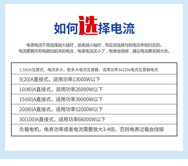 (五)三相預(yù)付費(fèi)電度表(公用表)的選型:電表電流不是越大越好,或者越小越好,而應(yīng)選擇與使用功率相對(duì)應(yīng)的預(yù)付費(fèi)電表,具體如下