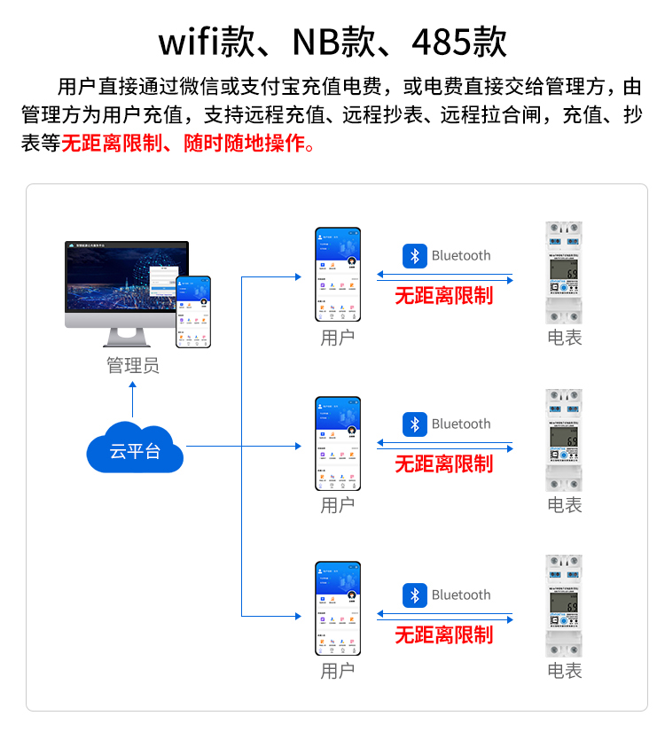 本公司DDSY6111/DDZY6111遠程智能電表與本公司遠程抄表系統(tǒng)和手機APP配套使用,遠程抄表管理系統(tǒng)具有實時抄表、定時抄表外,還提供了設(shè)備管理功能,如告警、余額短信通知、遠程充值、手機抄表、手機查詢、手機充值、預(yù)付費、后付費、自助充值機充值、遠程拉合閘、各種查詢報表、統(tǒng)計報表下載等功能。