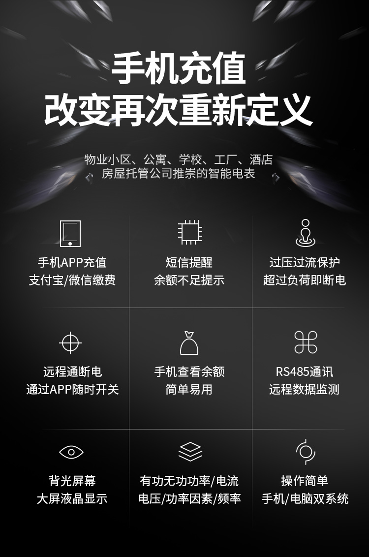 遠(yuǎn)程充值電表是針對(duì)電表的抄表工作而設(shè)計(jì)的遠(yuǎn)程抄表通訊網(wǎng)絡(luò)系統(tǒng)。它溶合了業(yè)內(nèi)4G技術(shù),結(jié)合了本公司多年來(lái)遠(yuǎn)程抄表的經(jīng)驗(yàn),以及多年來(lái)的數(shù)據(jù)傳輸經(jīng)驗(yàn),是一套造價(jià)及運(yùn)行費(fèi)用低廉、組網(wǎng)方便、可擴(kuò)展性強(qiáng)的遠(yuǎn)程抄表系統(tǒng)。該系統(tǒng)由中心數(shù)據(jù)后臺(tái)計(jì)算機(jī)、中心后臺(tái)軟件、中心數(shù)據(jù)庫(kù)服器、無(wú)線網(wǎng)絡(luò)、電能采集器、帶RS485接口的電能表。